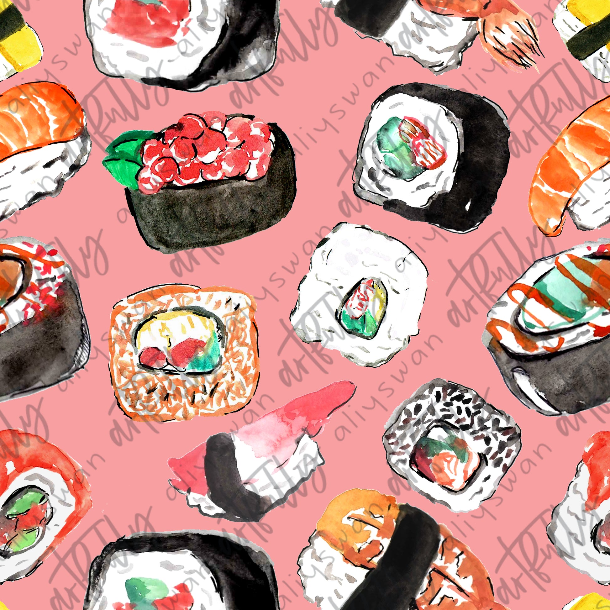 Watercolor sushi on a pink background